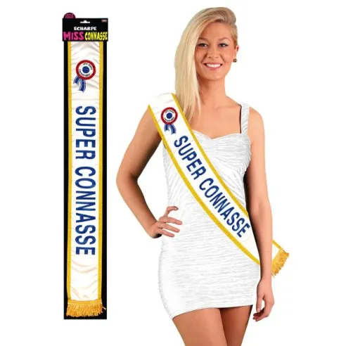 Pour toute occasion cette écharpe "Super Miss" sera parfaite. Satinée aux bordures dorées, écriture bleu pailletée, franges dorées et cocarde tricolore, cette écharpe s'apparente à celle de Miss France. Une fois placée sur l'épaule et en diagonale sur la poitrine, elle fera à coup sûr son effet !