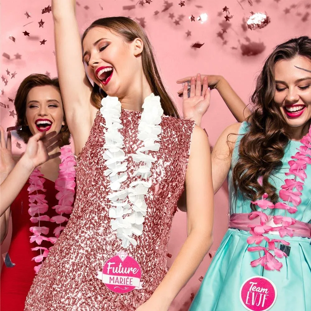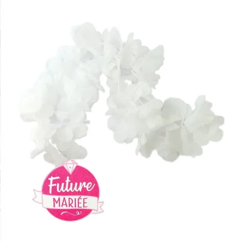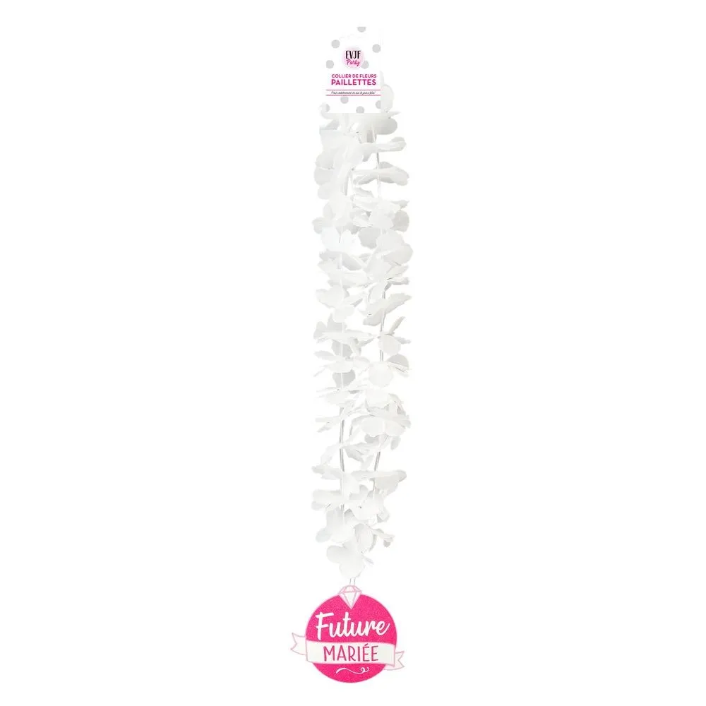 Collier de fleurs blanches avec petit écriteau rose "Future Mariée" pour enterrement de vie de jeune fille entre copines. Nombreux accessoires pour votre EVJF vous attendent chez Festimania.