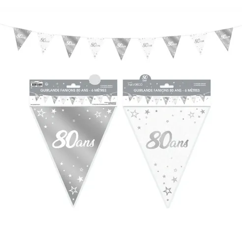 Guirlandes fanions anniversaire métallique argent - 80ans