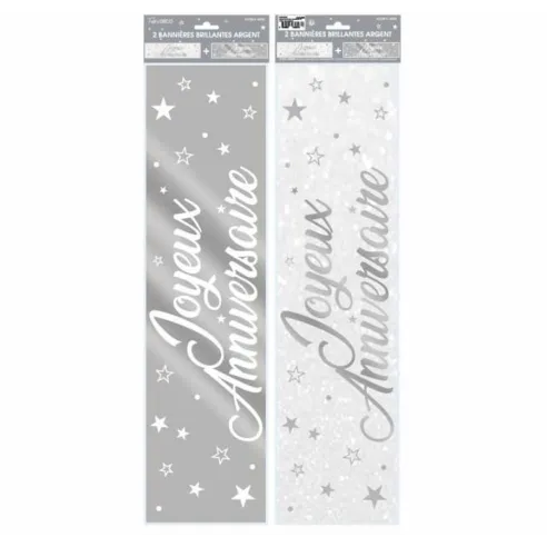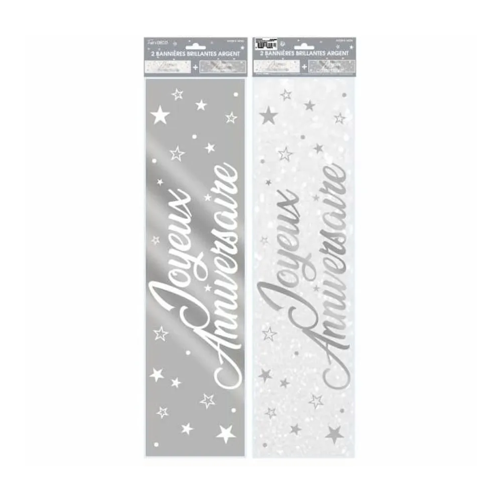 Lot de deux bannières colorées avec le texte Joyeux Anniversaire pour décorer sa maison ou une salle. Bannières aux effets brillants d'une longueur d'environ 60cm chacune.
