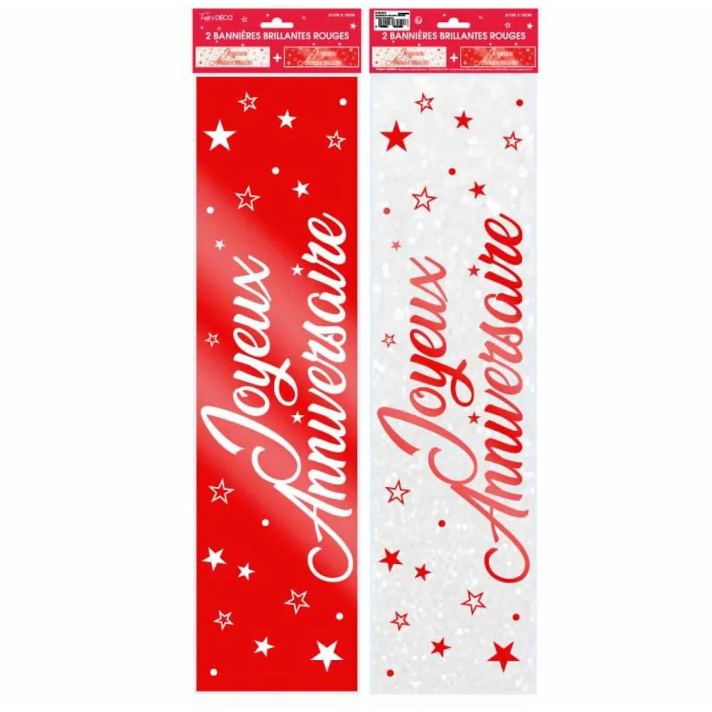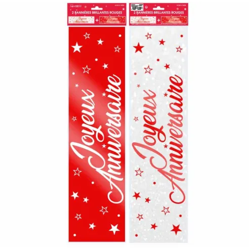 Lot de deux bannières colorées avec le texte Joyeux Anniversaire pour décorer sa maison ou une salle. Bannières aux effets brillants d'une longueur d'environ 60cm chacune.