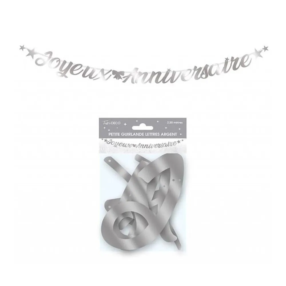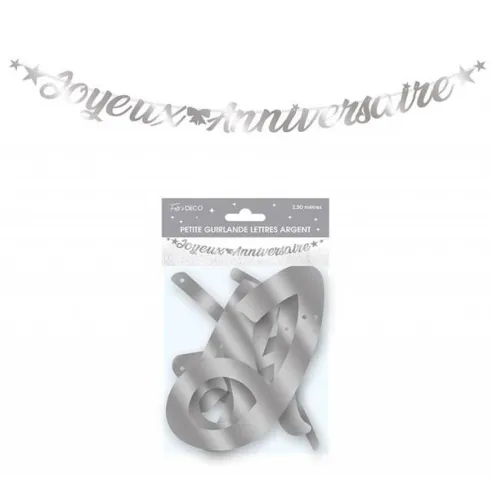 Guirlande en forme de lettres avec le texte Joyeux Anniversaire imprimé sur un papier cartonné métallisé et d'une longueur de 2,50m. A suspendre à la maison ou dans une salle des fêtes pour une décoration brillante.