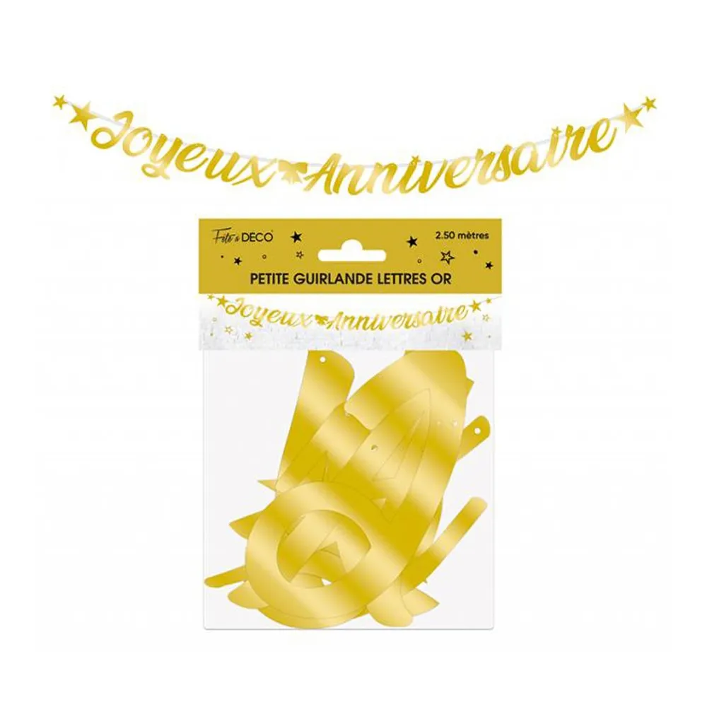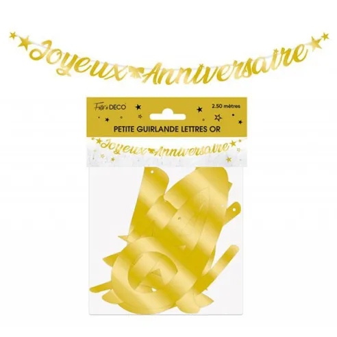 Guirlande en forme de lettres avec le texte Joyeux Anniversaire imprimé sur un papier cartonné métallisé et d'une longueur de 2,50m. A suspendre à la maison ou dans une salle des fêtes pour une décoration brillante.