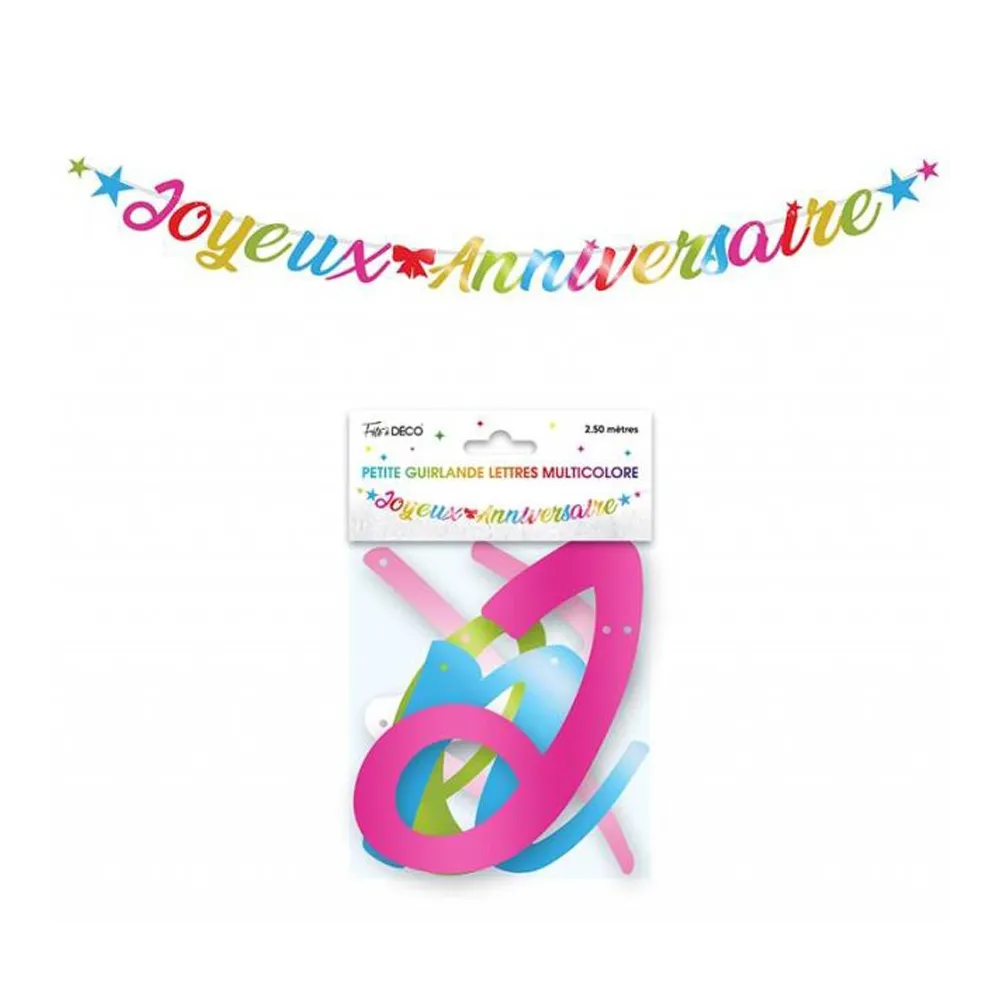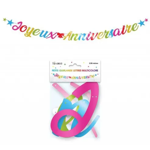 Guirlande en forme de lettres avec le texte Joyeux Anniversaire imprimé sur un papier cartonné métallisé et d'une longueur de 2,50m. A suspendre à la maison ou dans une salle des fêtes pour une décoration brillante.