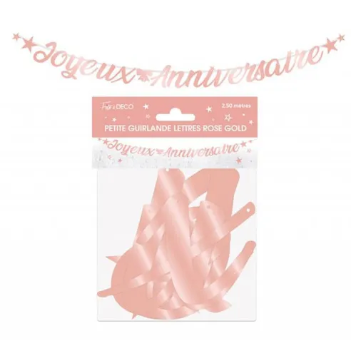 Guirlande en forme de lettres avec le texte Joyeux Anniversaire imprimé sur un papier cartonné métallisé et d'une longueur de 2,50m. A suspendre à la maison ou dans une salle des fêtes pour une décoration brillante.