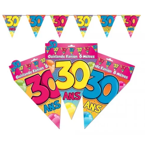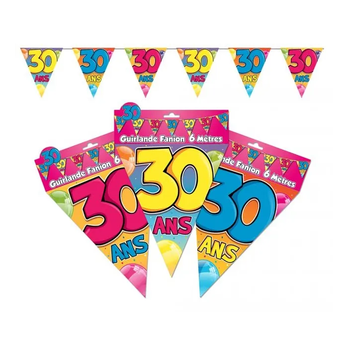 Vous recherchez une décoration festive et colorée pour fêter une nouvelle décennie? Cette guirlande fanion est faite pour vous. En papier plastifié elle mesure 6 mètres de long et comprend 15 fanions alternant 3 coloris différents, découpable à la longueur de votre choix. Aux dessins festifs, elle prendra une place remarquée aussi bien sur un mur que sur un buffet.