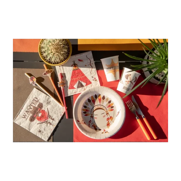 Assiettes sur le thème des indiens et des cowboysMatière: carton Dimension: 22.5cm Quantité: 10