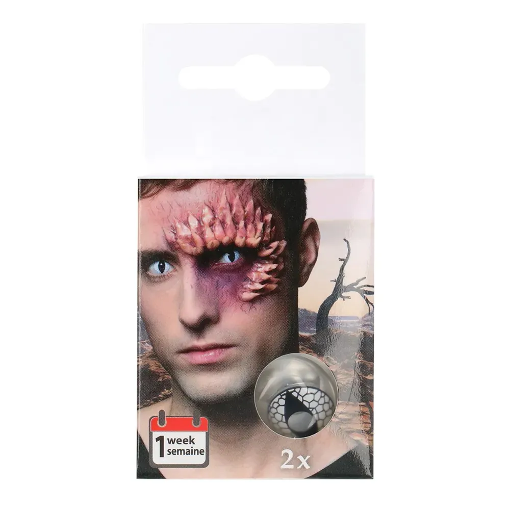 Avec ces lentilles blanches d'Halloween, vous vous prendrez bientôt pour un véritable dragon. Les lentilles ont des pupilles allongées entourées d'écailles comme un reptile ou un dragon. Il est également très agréable d'utiliser ces lentilles sur le thème des dinosaures. Ce sont des lentilles souples sans prescription.