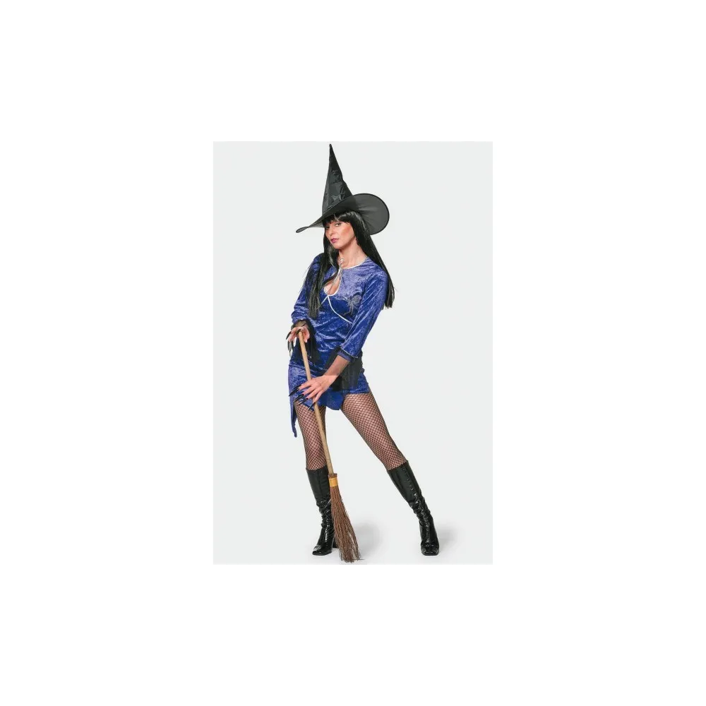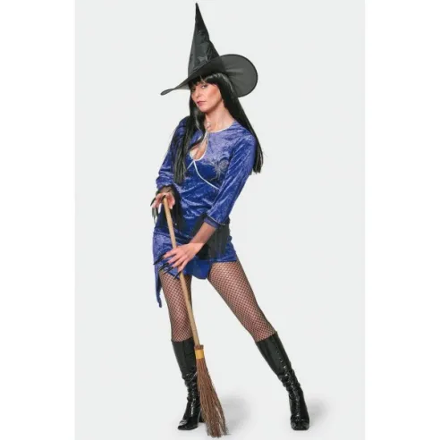 Déguisement de sorcière sexy avec robe courte bleue aux motifs araignée de couleur diamant.