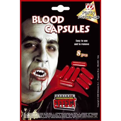Transformez-vous en véritable vampire avec les capsules de faux sang ! Glissez-les dans la bouche et croquez-les ! Du sang jaillira entre vos lèvres et vos amis auront l’impression que vous venez de mordre dans de la bonne chair fraiche !