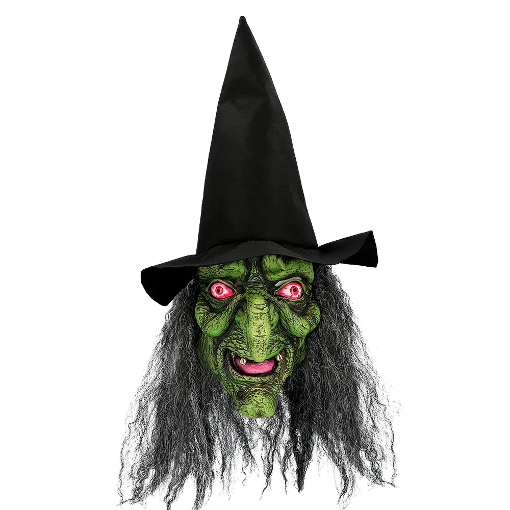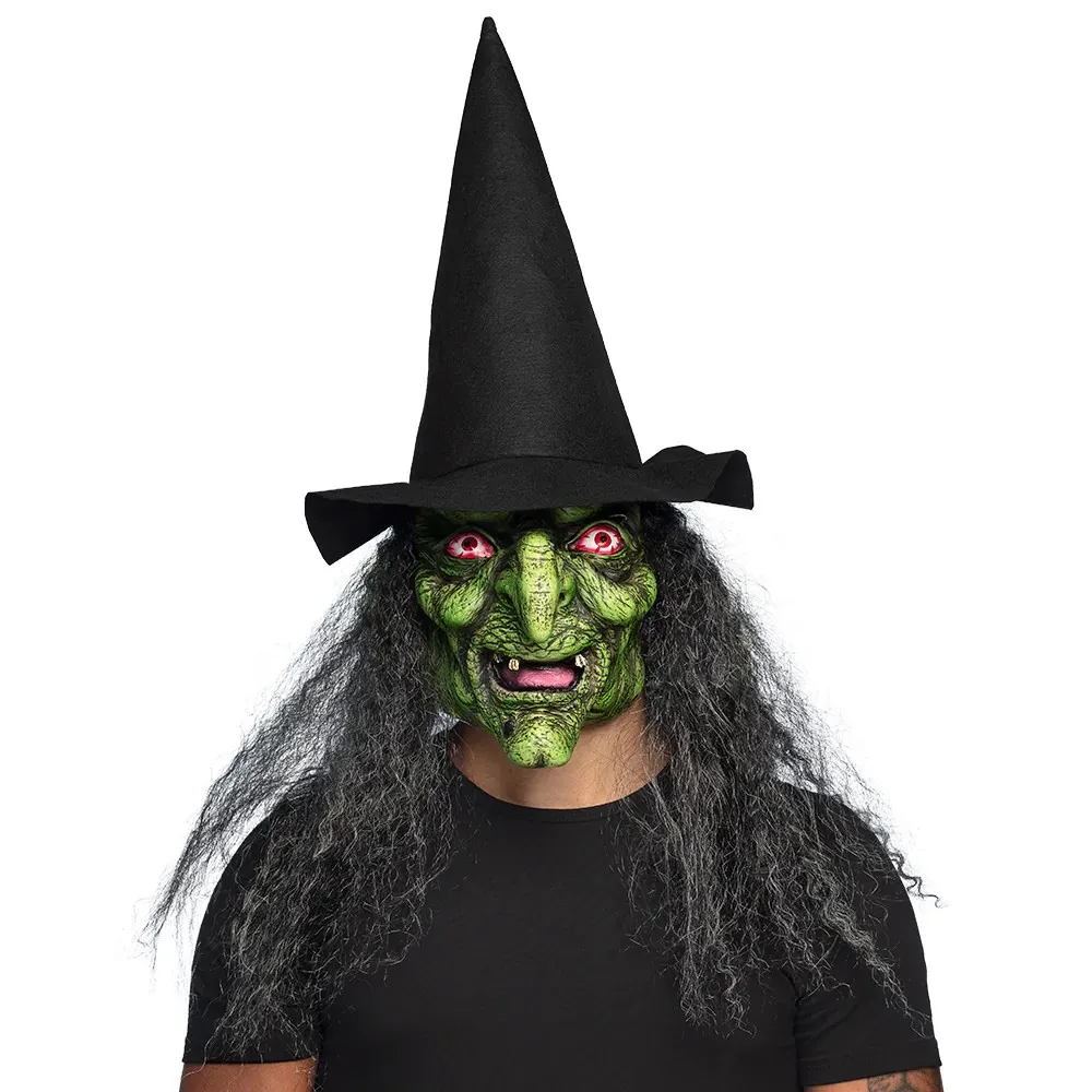 Avec son visage vert effrayant, son grand nez pointu, ses yeux rouges qui coulent, ses longs cheveux noirs ébouriffés et son grand chapeau de sorcière, ce masque est l'accessoire parfait pour créer en un instant le look sombre emblématique d'une sorcière maléfique. Idéal comme déguisement pour les maisons hantées, la chasse aux bonbons ou la fête d'Halloween.