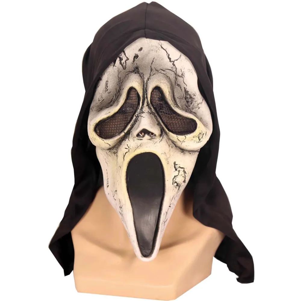 Masque souple Scream en latex avec petit voile pour adulte. Incarnez le tueur fou de la saga de films d'horreur culte avec son grand couteau sanguinolant.