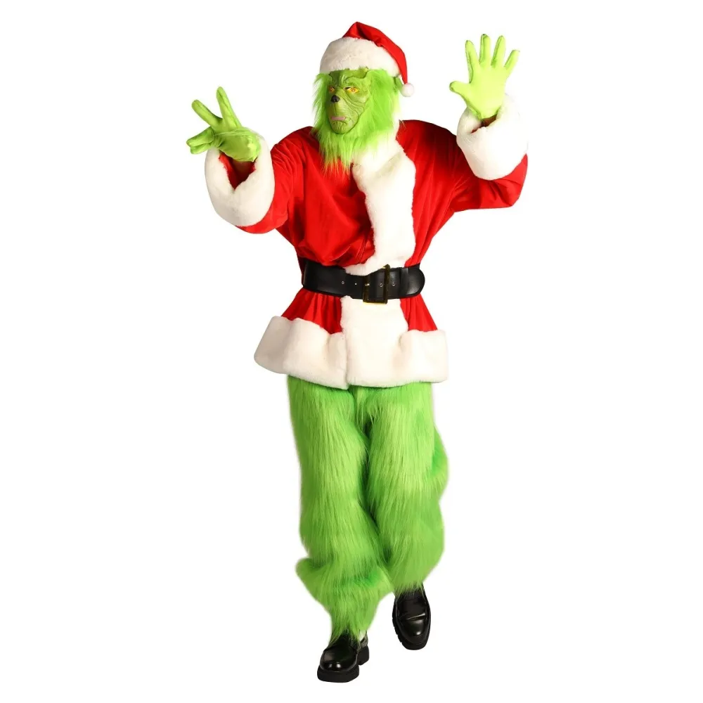 Manteau rouge avec fourrure blanche - Pantalon en fausse fourrure verte - Ceinture - Gants - Masque intégral avec bonnet de père noël