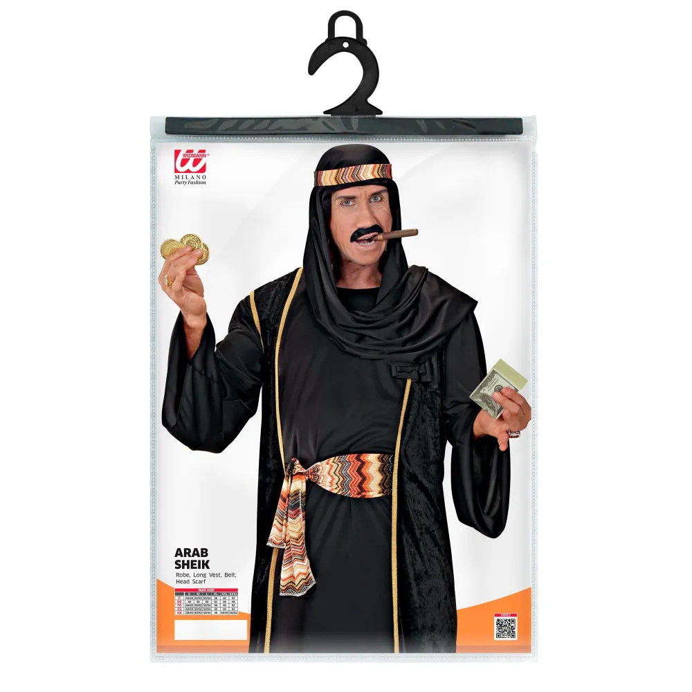 Ce costume de cheikh des pays arabes se compose d’une tunique longue noire d’inspiration traditionnelle, complétée par une ceinture assortie et la coiffe typique de la région.