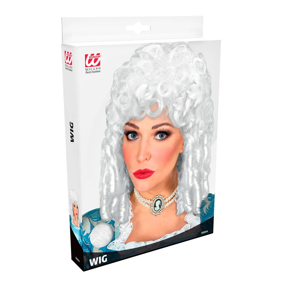Perruque de marquise blanche bouclée qui évoque les styles historiques des cours royales européennes. Postiche adéquat pour jouer le rôle d'une noble dame ou une icône de l’époque Marie-Antoinette lors de vos événements costumés.
