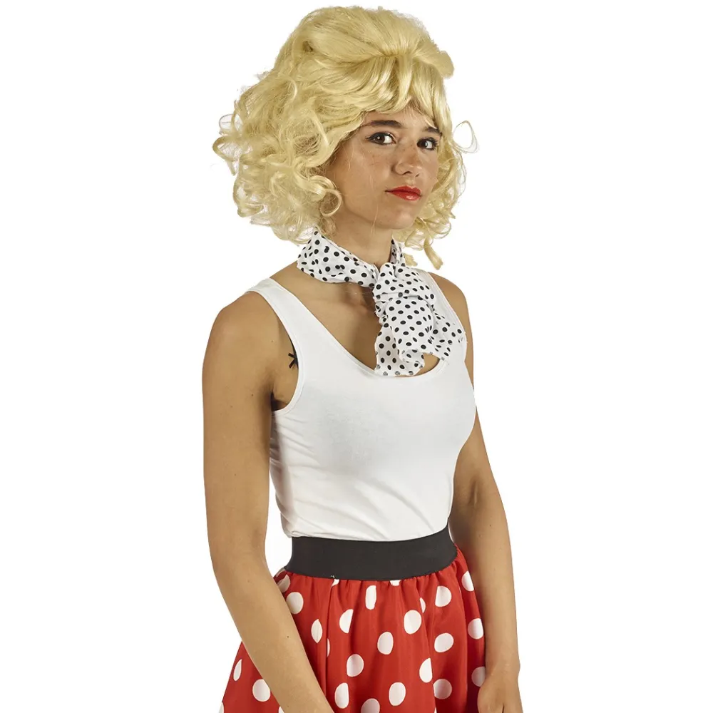 Perruque fifties pin-up blonde pour femme, rappelant le style de coupe qui pouvait se faire dans les années 1950/1960. Adoptez un nouveau look et changez d'époque avec les perruques Festimania.