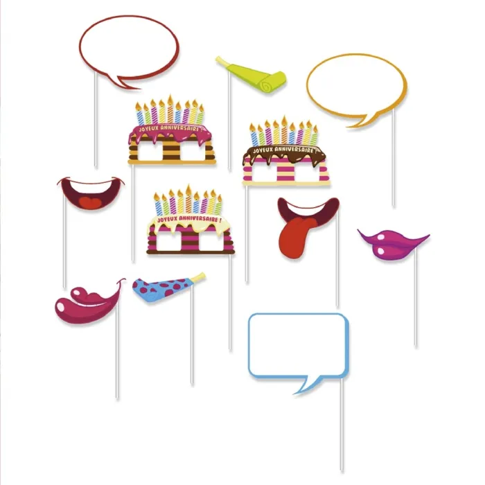 À l’intérieur, vous retrouverez 12 accessoires sur tige en plastique plus funs les uns que les autres : 4 fausses bouches, 3 paires de lunettes en forme de gâteaux d’anniversaire, 2 langues de belle-mère ainsi que 3 bulles dans lesquelles vous pourrez ajouter des mots au montage.