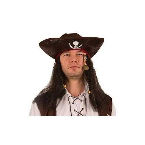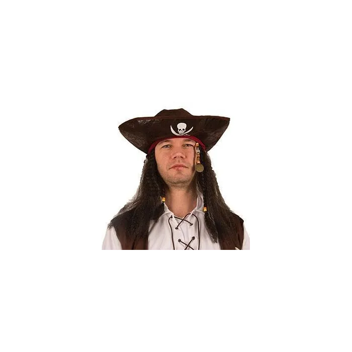 Tricorne en simili cuir marron avec cheveux de pirate pour adultes