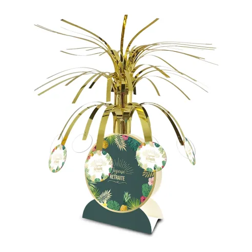 Cet accessoire de décoration verte et dorée se compose d'une base en cercle sur son socle aux motifs tropicaux et d'un palmier doré comportant des badges "Joyeuse Retraite". Faites de cet évènement un moment inoubliable avec ce centre de table original !