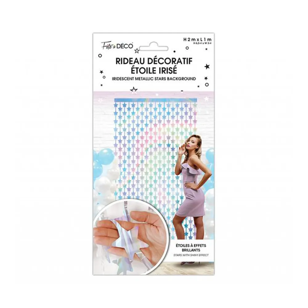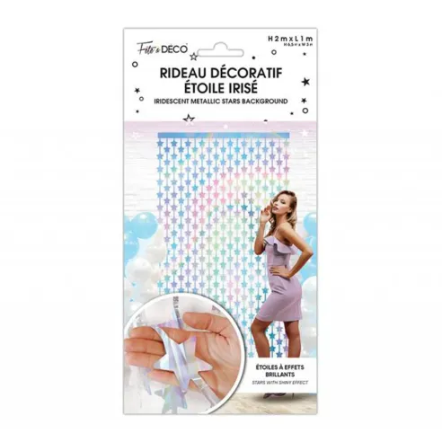 Rideau décoratif étoiles irisées métallisé à suspendre à une porte ou mur, mesurant deux mètres de hauteur pour un de largeur. Pour une décoration étoilée et brillante dans la nuit.