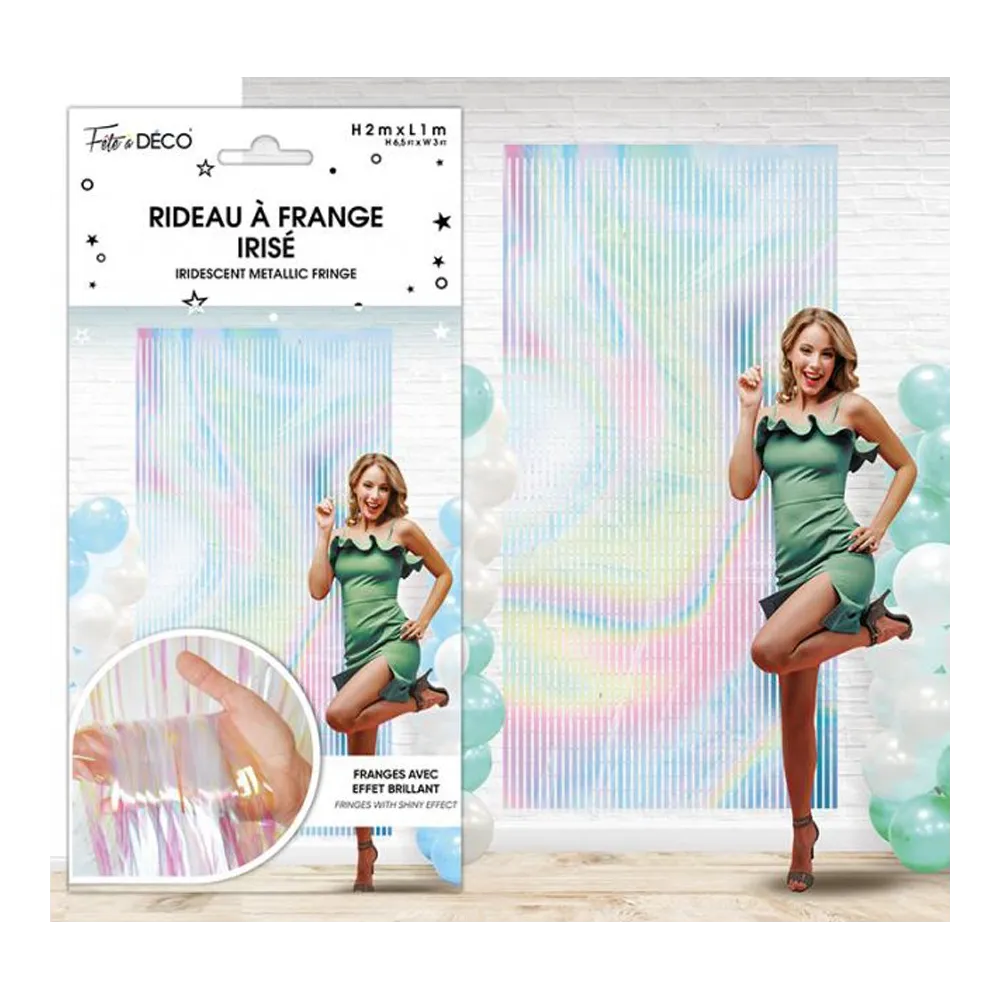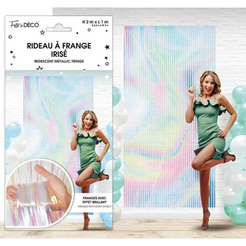 Rideau décoratif à franges irisées métallisées à accrocher à une porte ou mur, mesurant deux mètres de hauteur pour un de largeur. Pour une décoration brillante et originale rendez-vous chez Festimania.