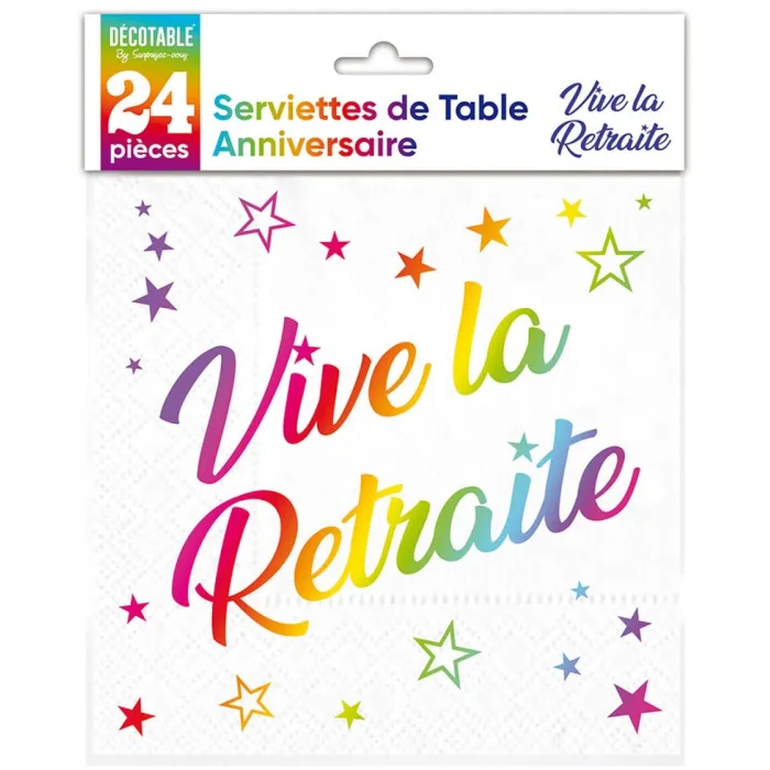 Serviettes retraite métalliséesMatière: Papier 3 plis Dimensions: 16.5 x 16.5 cm (plié) / 33 x 33cm (déplié) Quantité: 24