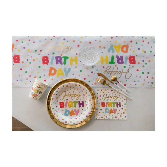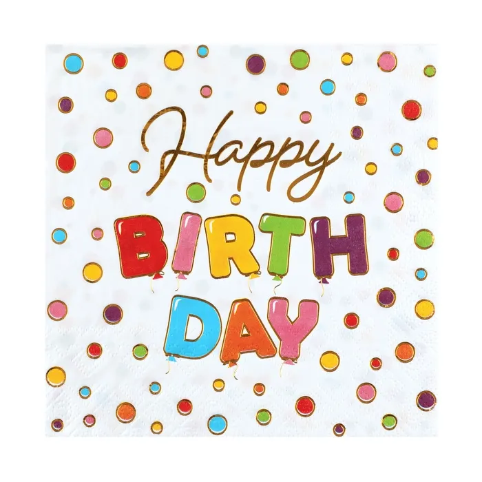 Serviettes joyeux anniversaire métallisé Matière: Papier 3 plis Dimensions: 16.5 x 16.5 cm (plié) / 33 x 33cm (déplié) Quantité: 24