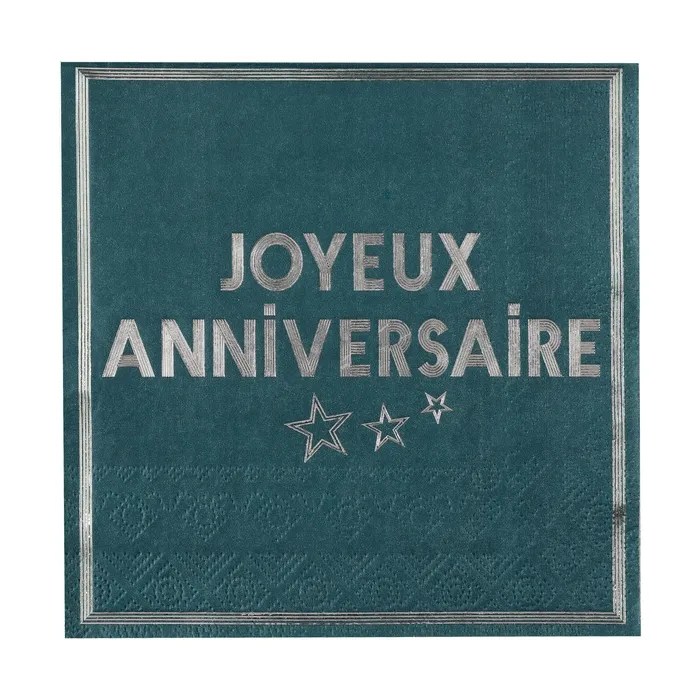 Serviettes joyeux anniversaire métallisé Matière: Papier 3 plis Dimensions: 16.5 x 16.5 cm (plié) / 33 x 33cm (déplié) Quantité: 24