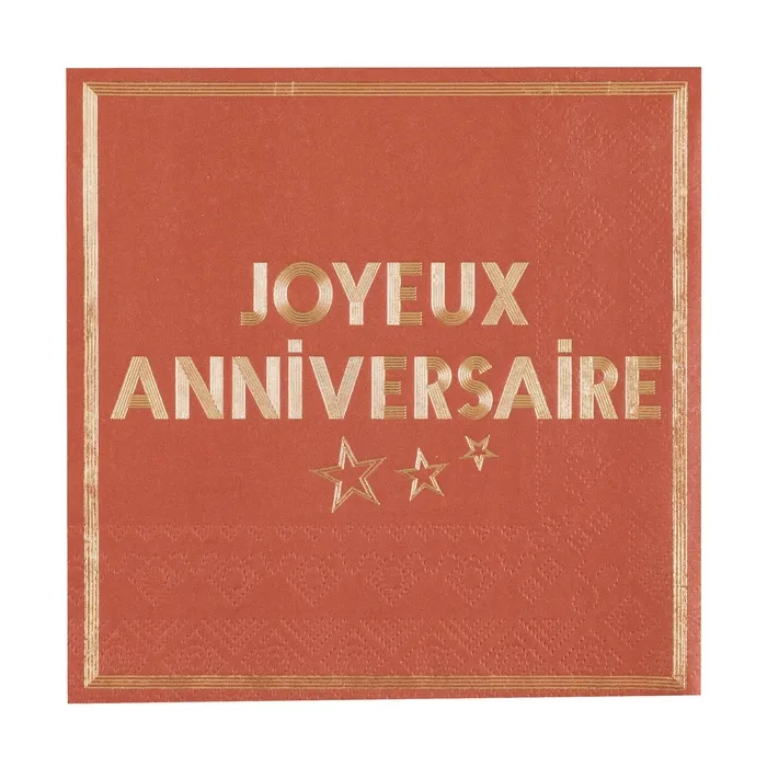 Serviettes joyeux anniversaire métallisé Matière: Papier 3 plis Dimensions: 16.5 x 16.5 cm (plié) / 33 x 33cm (déplié) Quantité: 24