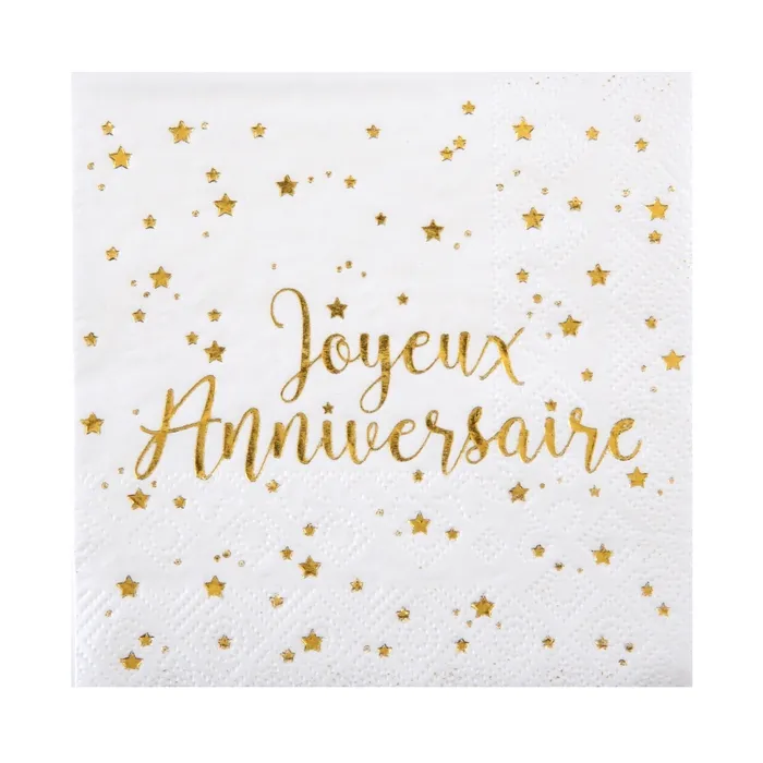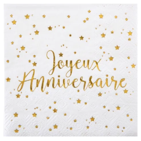 Serviettes joyeux anniversaire métallisé Matière: Papier 3 plis Dimensions: 16.5 x 16.5 cm (plié) / 33 x 33cm (déplié) Quantité: 24