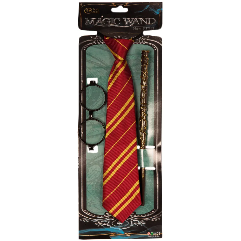 Transformez votre déguisement en personnage magique avec ce set d'accessoires pour sorcier. Un ensemble comprenant la cravate rayée rouge et or, les lunettes rondes noires ainsi que la baguette magique pour compléter votre costume d'apprenti sorcier.