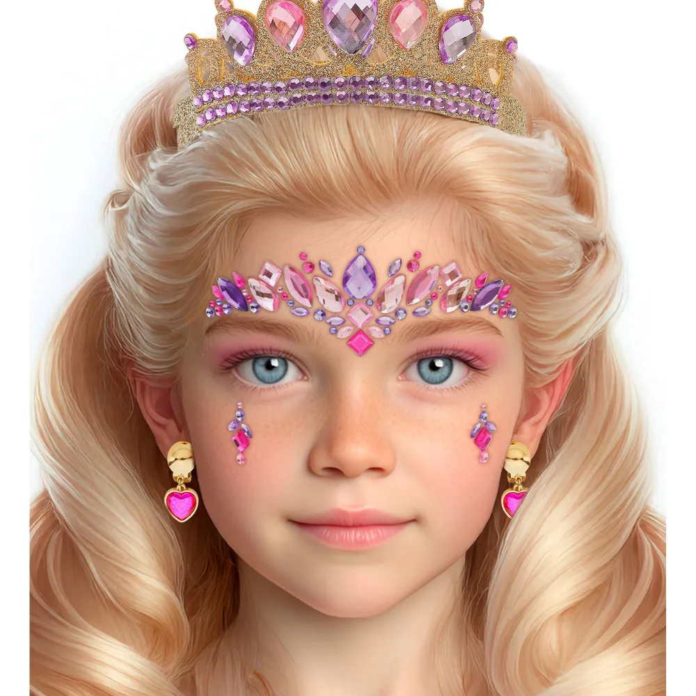 Strass maquillage brillants pour visage thème princesse, composé de petits diamants de formes variées, scintillants et autoadhésifs à appliquer sur le visage en quelques secondes. Un maquillage parfait réalisé facilement pour se rendre à un carnaval ou festival.