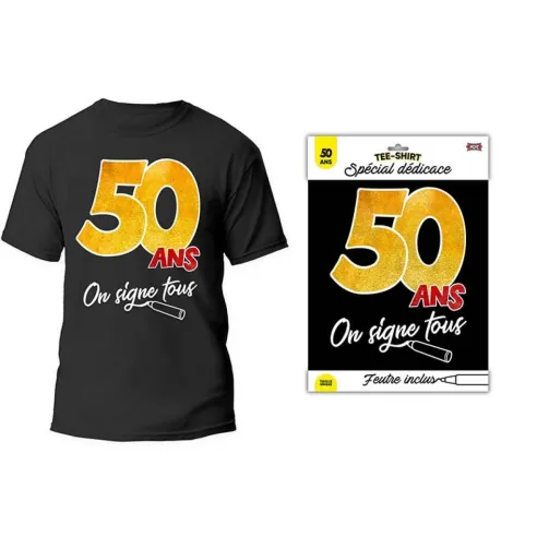 T-shirt noir anniversaire 50 ans à signer, pour laisser une dédicace ou un petit mot en souvenir lors d'une fête d'anniversaire en famille ou entre amis, feutre inclus.