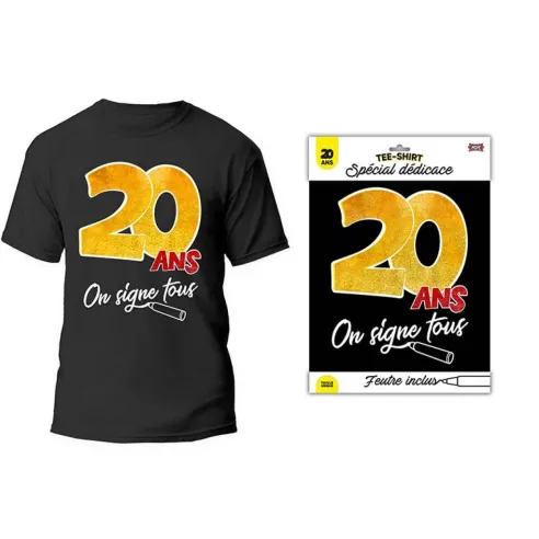 T-shirt noir anniversaire 20 ans à signer, pour laisser une dédicace ou un petit mot en souvenir lors d'une fête d'anniversaire en famille ou entre amis, feutre inclus.