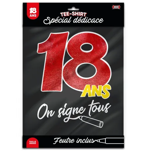 T-shirt noir anniversaire 18 ans à signer, pour laisser une dédicace ou un petit mot en souvenir lors d'une fête d'anniversaire en famille ou entre amis, feutre inclus.