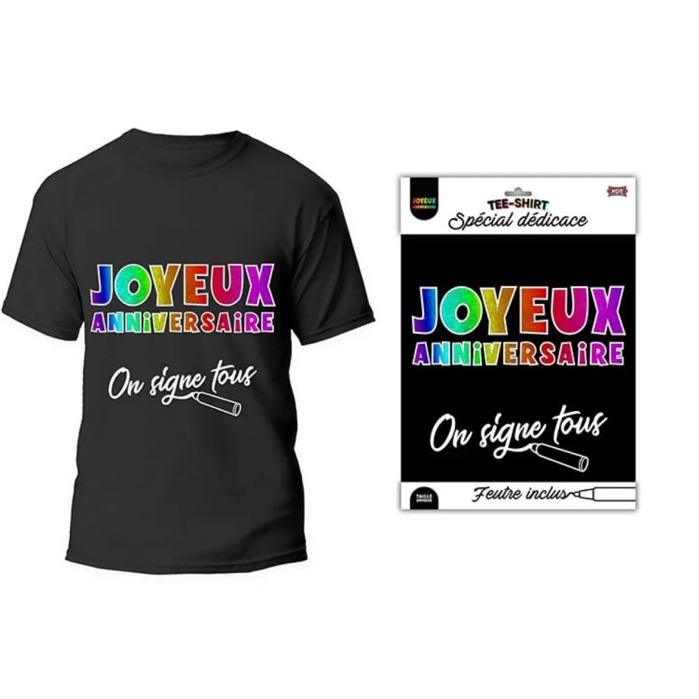 T-shirt noir anniversaire Joyeux Anniversaire multicolore à signer, pour laisser une dédicace ou un petit mot en souvenir lors d'une soirée d'anniversaire en famille ou entre amis, feutre inclus.