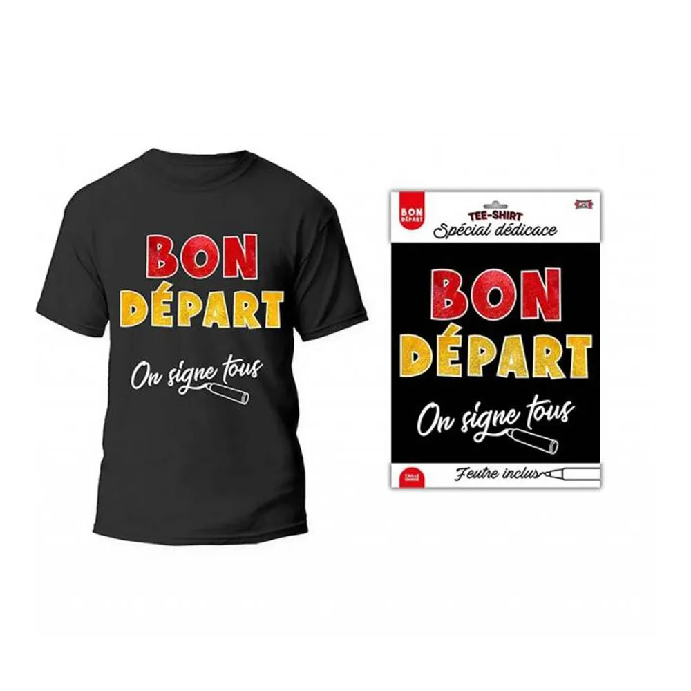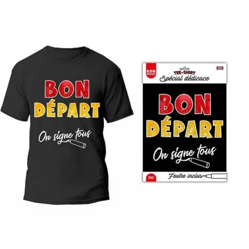T-shirt noir Bon Départ à signer, pour laisser une dédicace et un petit mot en souvenir lors d'un pot de départ entre collègues, feutre inclus.