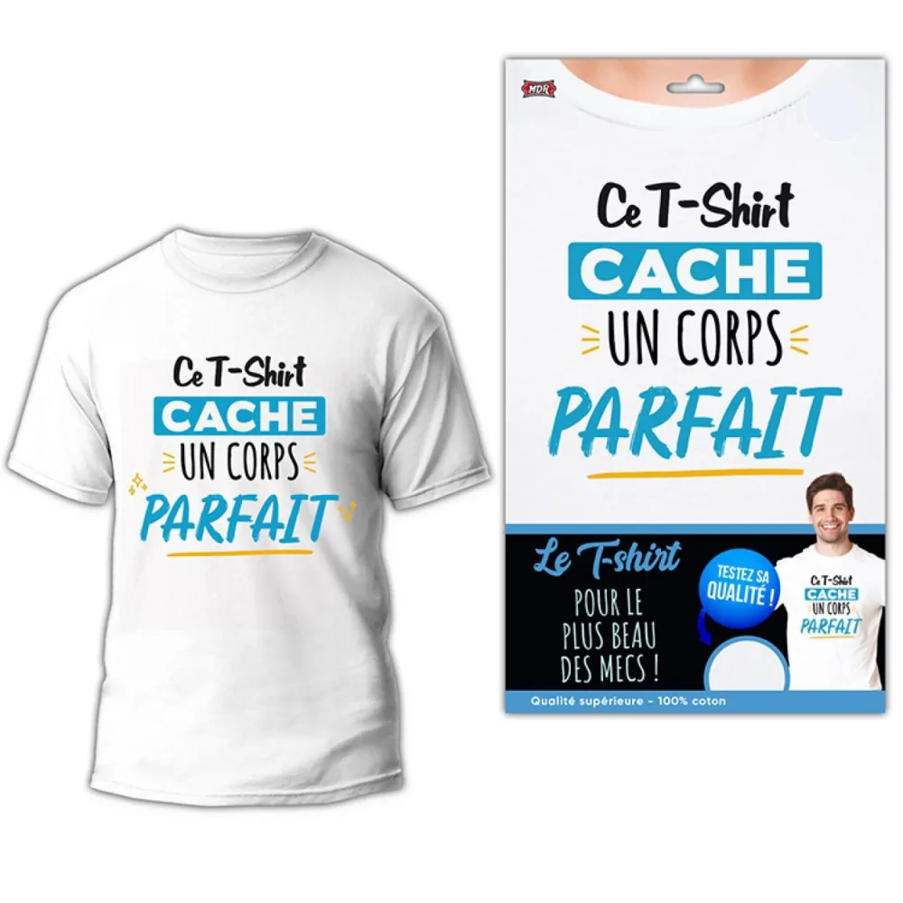 T-shirt blanc humoristique à offrir à un ami, avec le texte Ce t-shirt cache un corps parfait. Nombreux modèles plus drôles les uns que les autres à découvrir d'urgence dans votre magasin Festimania.