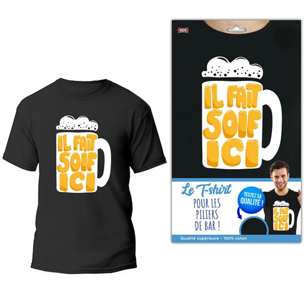 T-shirt noir humoristique à offrir en cadeau à un ami, avec une chope de bière imprimée et le texte Il fait soif ici. Nombreux modèles hilarants à découvrir d'urgence dans votre magasin Festimania.