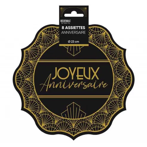 8 assiettes Joyeux Anniversaire cartonnées thème Art Déco dans les tons noirs et dorés, pour donner un style rétro à votre déco de table. D'un diamètre de 23cm elles sont parfaites pour servir gâteaux, desserts ou snacks.