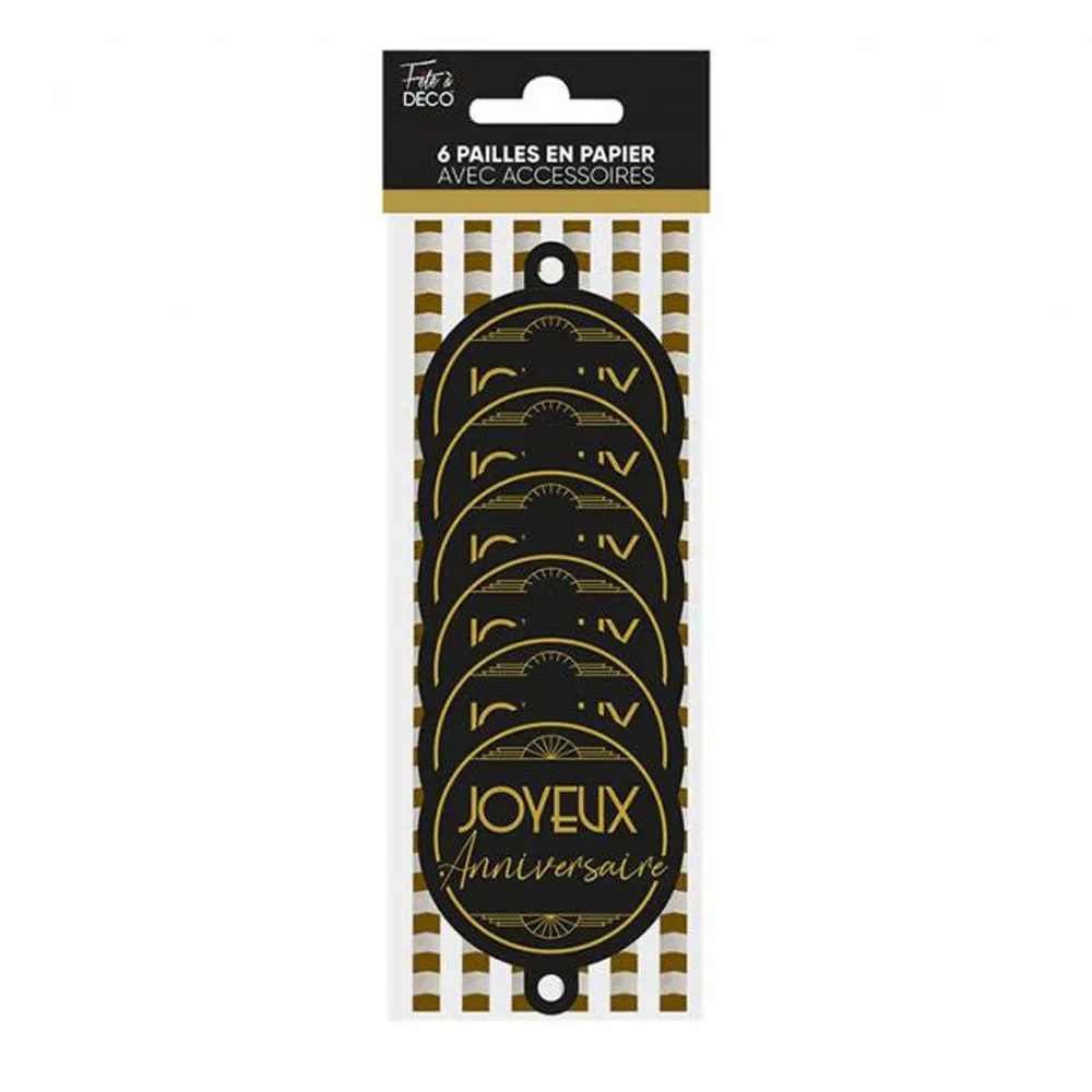 Lot de 12 pailles rayées blanc et doré, thème Art Déco avec accessoire décoratif Joyeux Anniversaire imprimé. Pour donner un style rétro à vos repas et apéro de fête.
