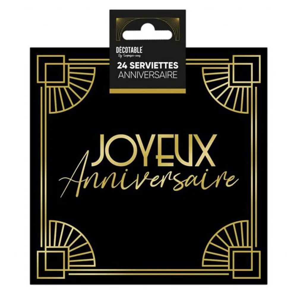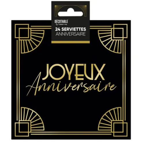 Lot de 24 serviettes papier thème Art Déco Joyeux Anniversaire de couleur noires et dorées. Pour donner un air rétro style années 1920 à vos tables de fête.