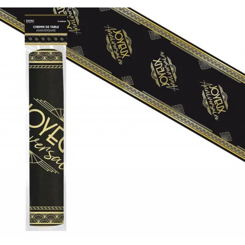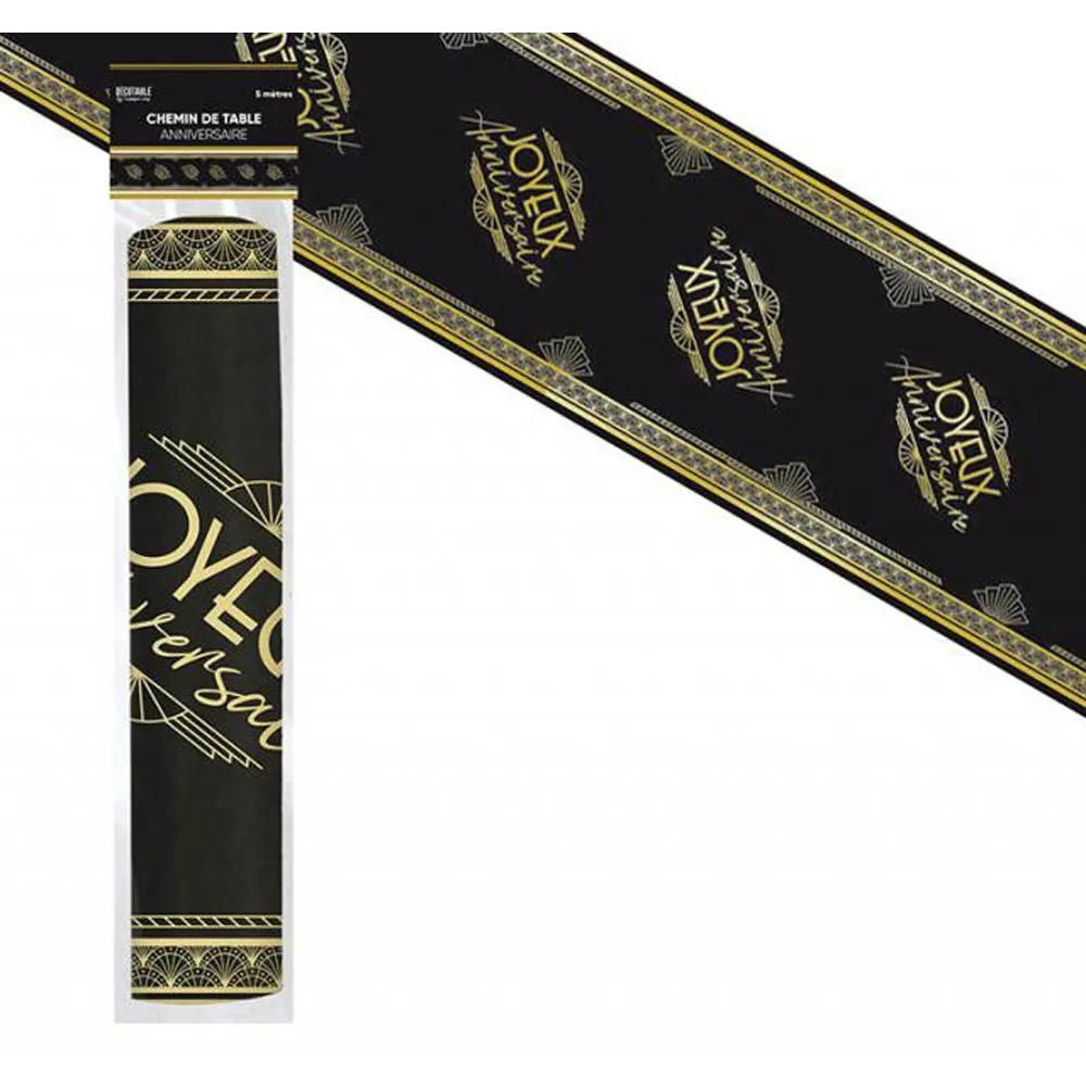 Chemin de table thème Art Déco Joyeux Anniversaire, dans les tons noirs et dorés imprimées sur une longueur de 5 mètres. Une décoration de table donnant un style rétro de la belle époque.