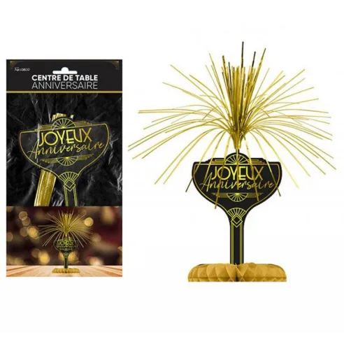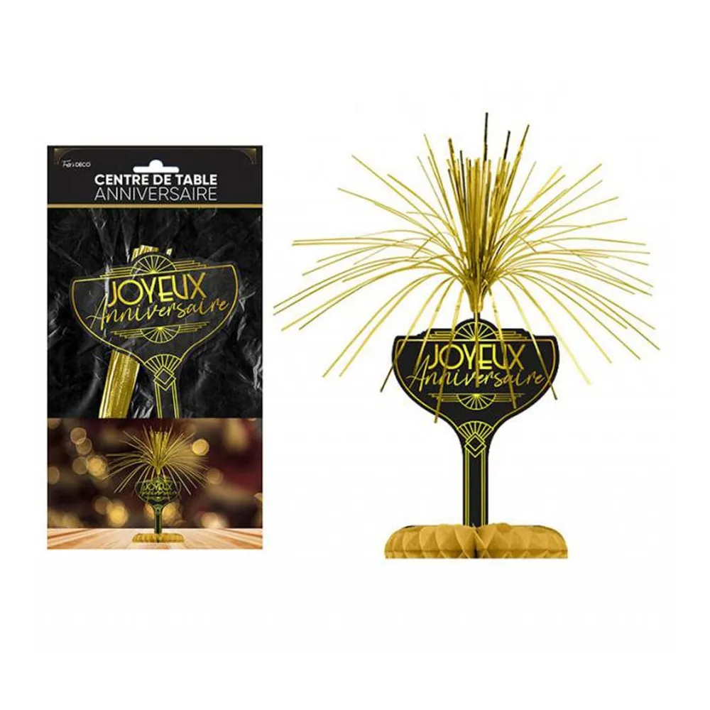 Centre de table thème Art Déco dans les tons noirs et dorés avec texte Joyeux Anniversaire imprimé. A répartir sur les tables de vos invités pour donner un style rétro à votre soirée.