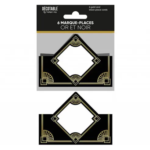6 marques places thème Art Déco pour table d'anniversaire, dans les tons noirs dorés et agrémentés de motifs variés. Pour placer facilement vos convives et donner un style rétro à votre décoration.