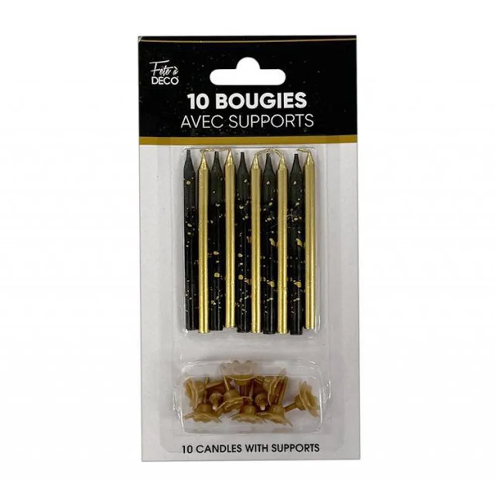 10 bougies thème Art Déco avec support pour décoration de gâteau d'anniversaire, de couleur noires et dorées elles ajoutent une touche rétro à votre déco.