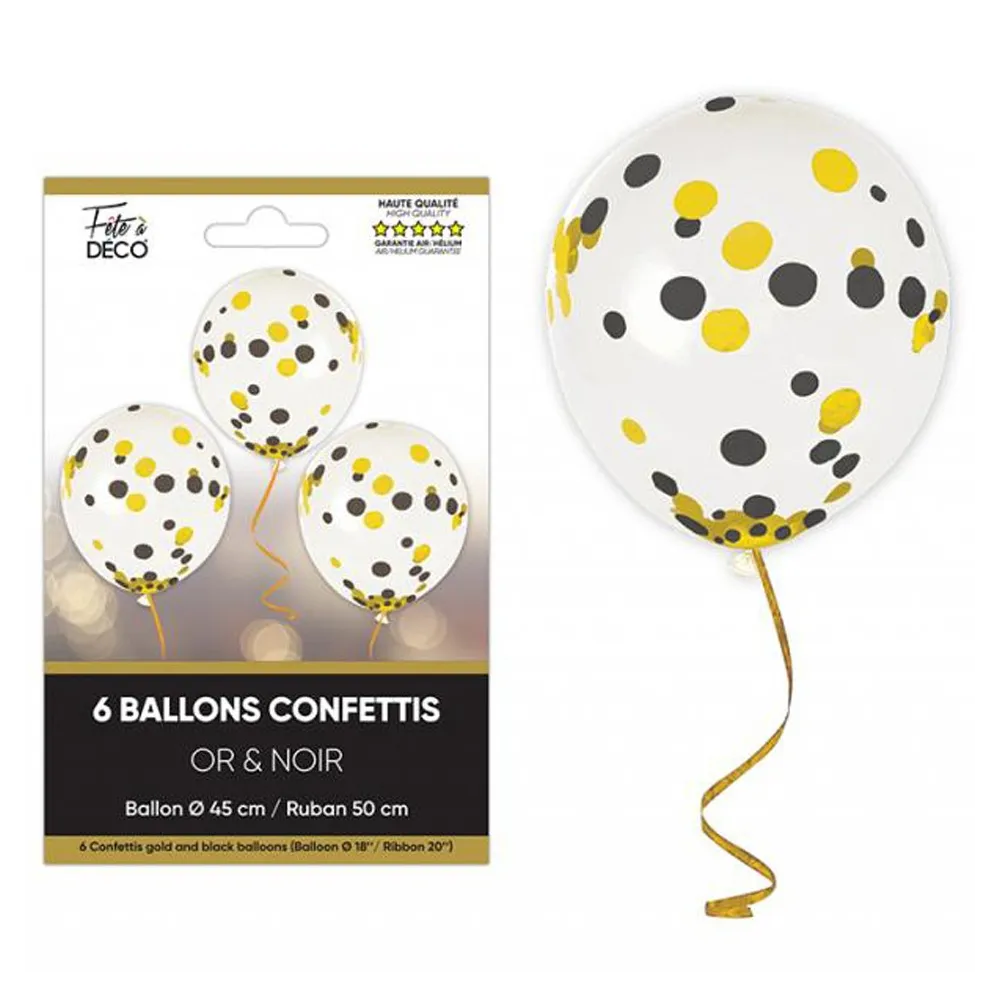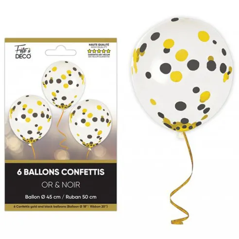 6 ballons confettis noirs et dorés thème Art Déco, avec rubans colorés et d'un diamètre de 45cm. Gonflage à l'air ou hélium pour donner un air rétro à votre décoration de salle.
