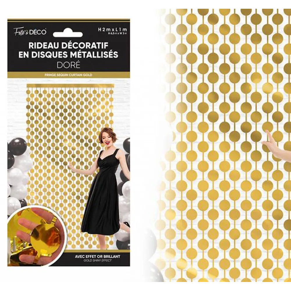 Rideau à franges métallisées thème Art Déco mesurant deux mètres de hauteur pour un de largeur. De couleur doré brillant il est parfait pour donner un air rétro à votre décoration de salle.