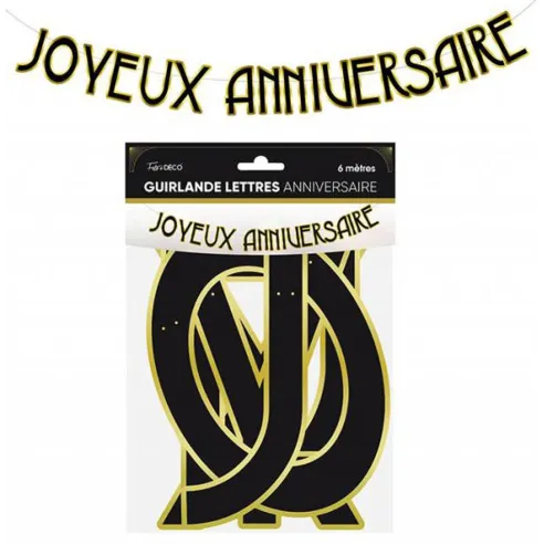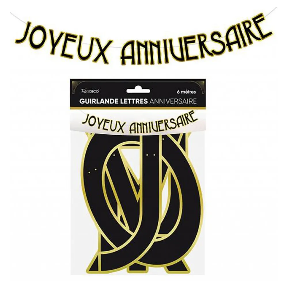 Guirlande lettres Joyeux Anniversaire thème Art Déco d'une longueur de 6 mètres avec fond noir et contours dorés. Pour une décoration de salle style rétro qui rappelle le début du vingtième siècle.