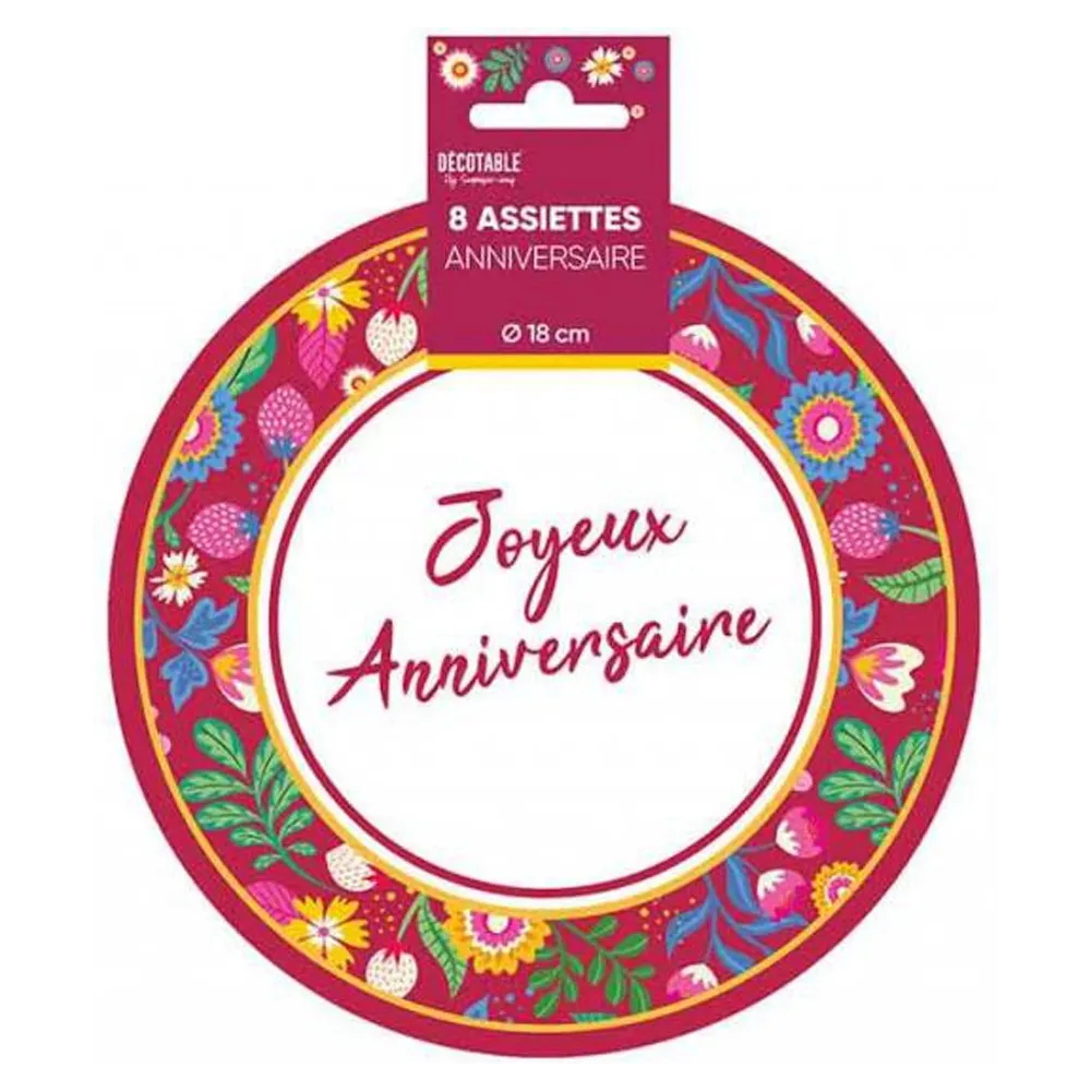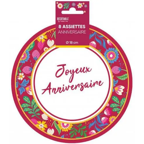 Fleurissez votre table d’anniversaire avec ces 8 assiettes Joyeux Anniversaire cartonnées thème floral. D'un diamètre de 18cm elles sont légères et résistantes. Parfait pour servir gâteaux, desserts, snacks ou amuse bouches.